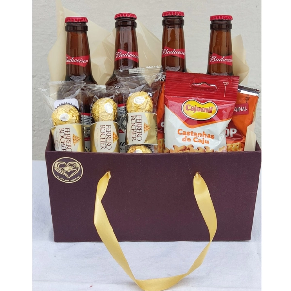 Cesta de Budweiser acompanhada de chocolates Ferrero Roche